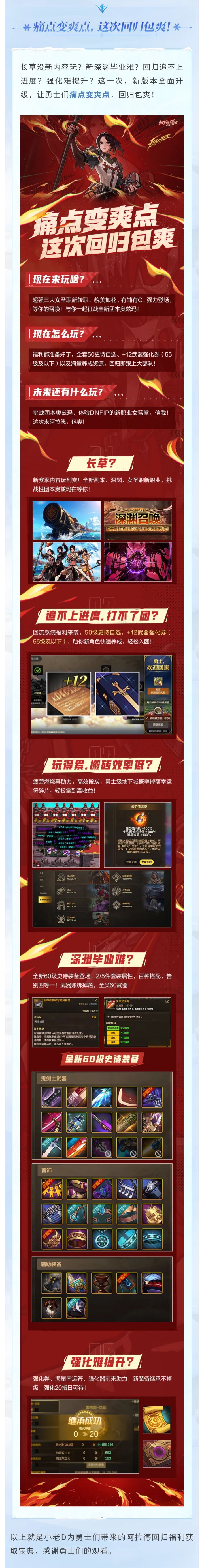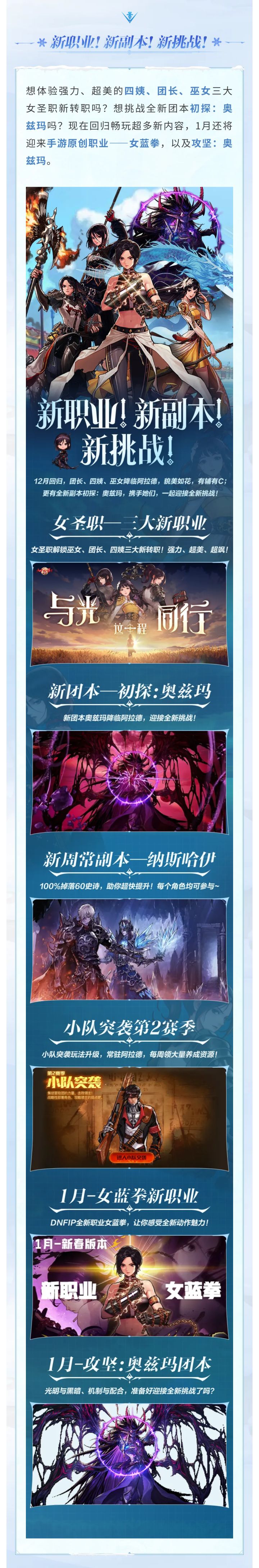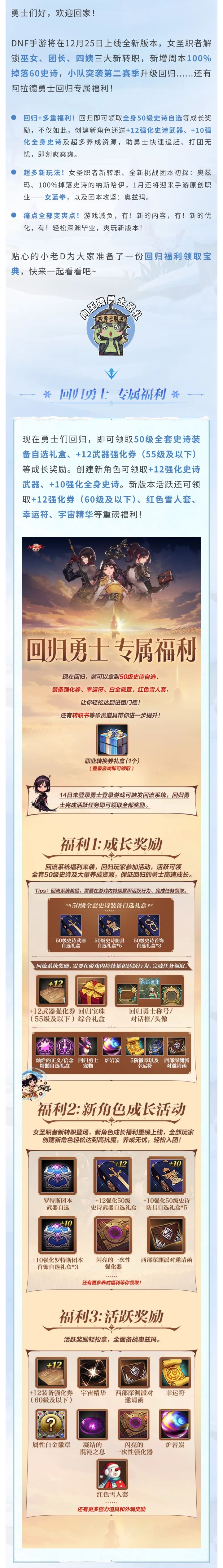 勇士们好!DNF手游将在12月25日上线全新版本,女圣职者解锁巫女、团长、四姨三大新转职,新增周本100%掉落60史诗,小队突袭第二赛季升级回归......还有阿拉德勇士回归专属福利!12月25日回归最佳!最全回流爽玩宝典来啦