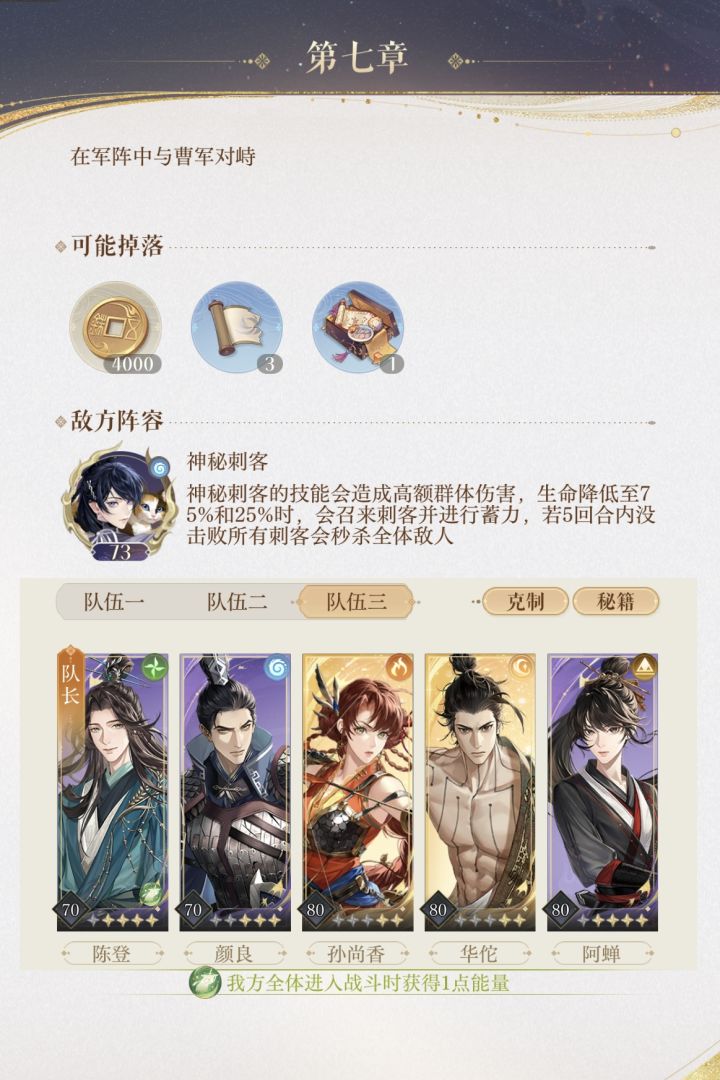 五回合内必须击败所有刺客否则失败。Boss大招会造成高额群伤,以及血量剩75%和25%时,会召唤2个小怪