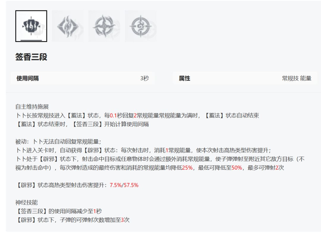常规技是一个常驻的状态,即卜卜的射击会消耗常规能量并且无法自然恢复,但是会大幅提升射击伤害并打出弹射效果。而主动使用的效果就是简单直白的充能,需要持续施法,会快速的恢复常规能量。战斗中要注意一下左下的常规能量槽,空了开技能充满就行,不然输出大幅降低。