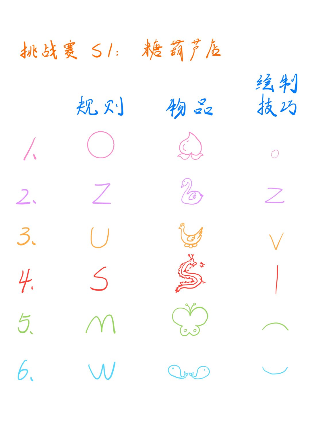 桃子画小圈,大鹅画z字,小鸡画v字,龙画l,蝴蝶画下括弧,鱼画上括弧。