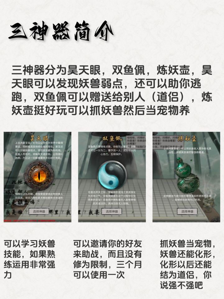 最后介绍一下三神器,三神器分为昊天眼,双鱼佩,炼妖壶,昊天眼可以发现妖兽弱点,还可以助你逃跑,双鱼佩可以赠送给别人(道侣),炼妖壶挺好玩可以抓妖兽然后当宠物养,甚至宠物还能化形结为道侣