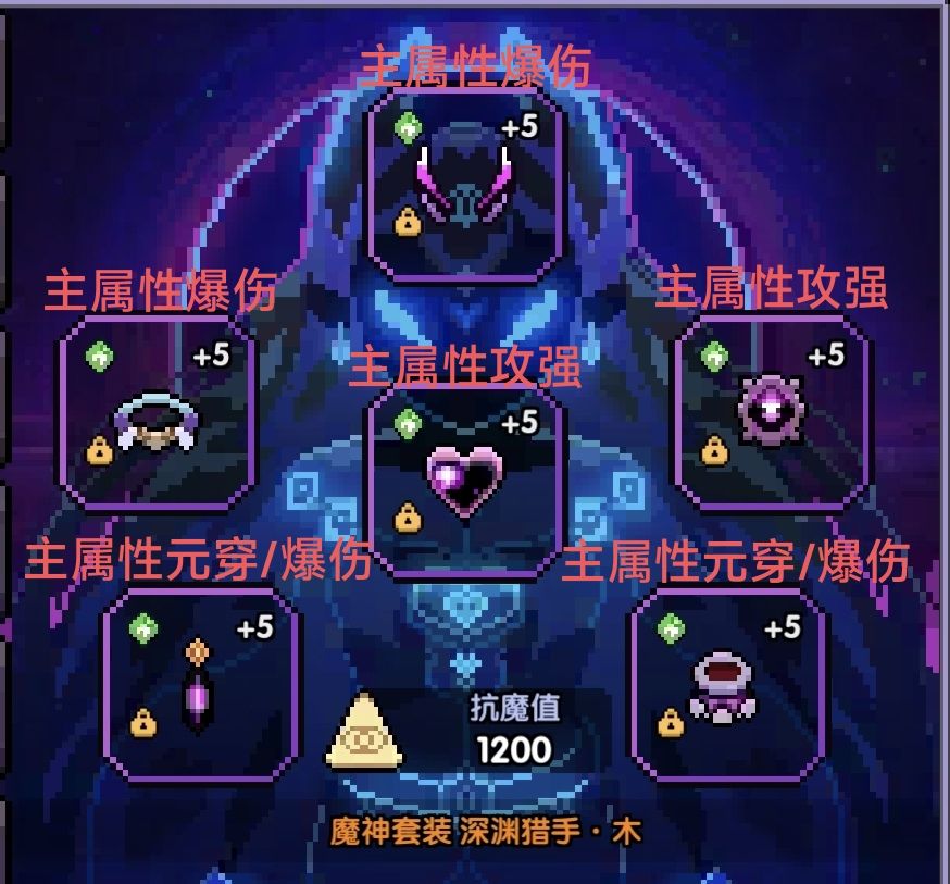 二阶外装主属性推荐如上,副属性推荐均为木攻、爆伤,如果为一阶外装,则魔角、核心、手镯、耳环选择元素穿透,腰带和徽章选择攻击强度/爆伤。