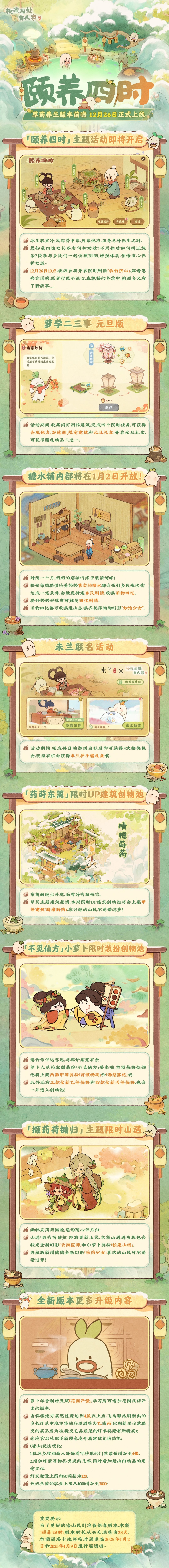 各位萝萝山山民好呀!全新草药养生主题版本「 颐养四时」即将于12月26日上线萝,快跟随小花一起来看看本次新版本的前瞻爆料内容吧!