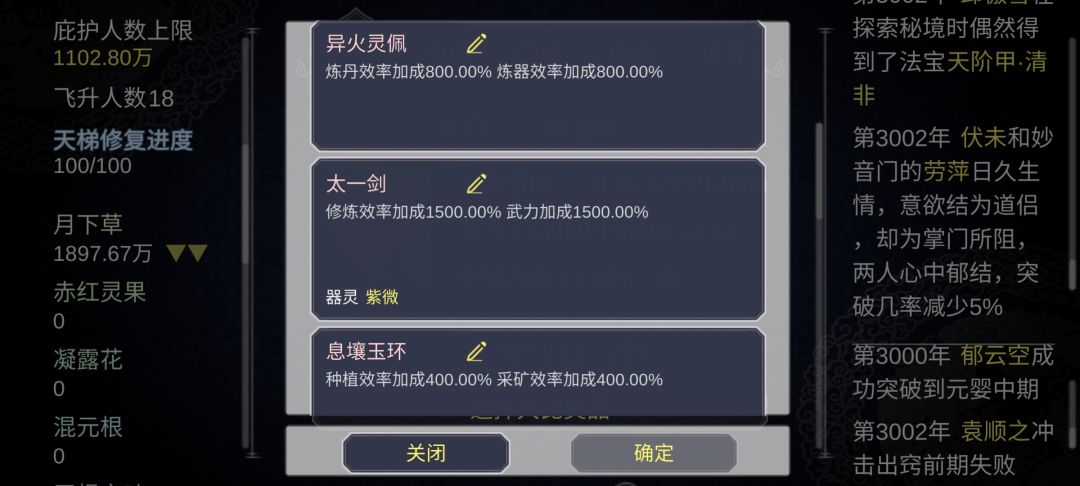 8.一点小技巧:当你终于能打过最后关卡了,就把炼丹效率最高的集合去炼丹,开两组或者三组,炼大成期和大成前期的丹药.把去百宝阁把炼器的材料买了买上1000万个最低级的那药草,其余材料抽空打打除魔卫道就够了。