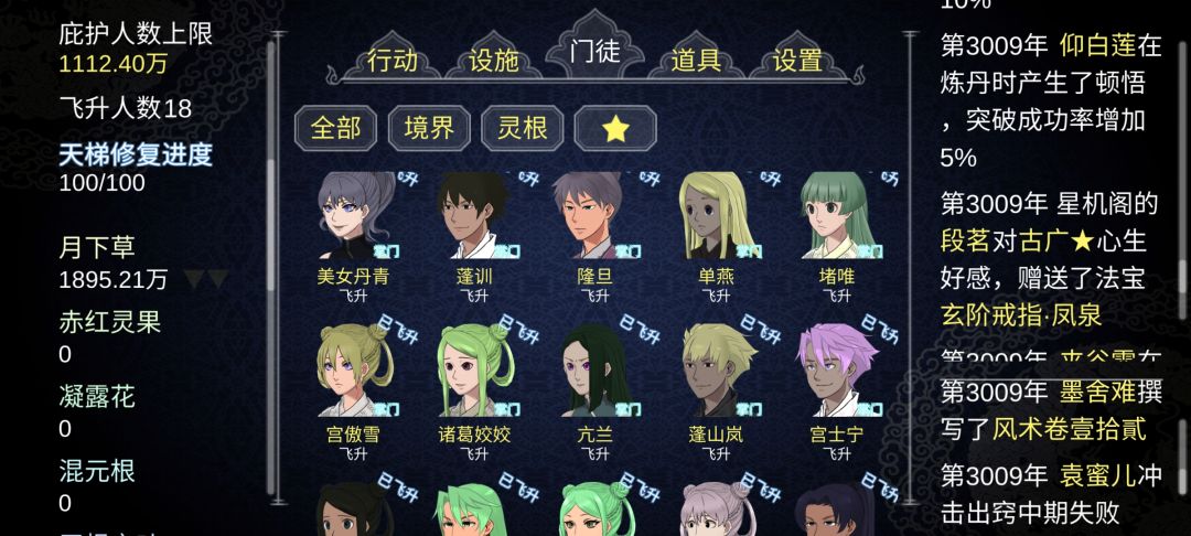5.弟子数量不要过多,前期凑7-8个起步就行,一定要精挑细选,因为结婚生子外出还能捡几个回来,多了以后烦不胜烦,而且灵根容易驳杂。中后期也要控制好,最高不要超50。