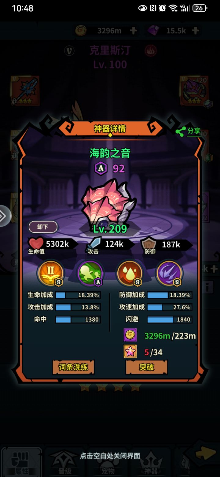 2.9更新:元宵节果然出了糕点活动,可惜进度卡在了11-35,克里暂时扛不住3水。附上我的神殿科技图和克里的神器图,等级不算高。但是这已经是平民玩家节省战士科技完全不点堆出来的了,如果能把血防闪再提升,还有很大空间。另外神器也是,只有2个提升闪避的技能,还有两个是废物技能,属性的血防也都不算太高。还有很大的开发空间。