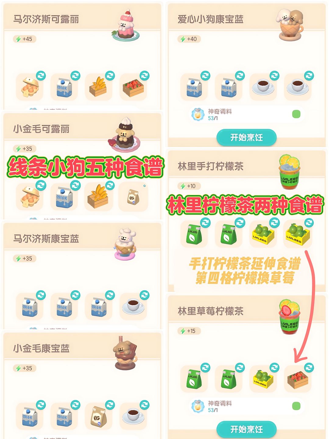 每日记得去文艺街“林里”快闪店购买“林里手打柠檬茶”的食谱和“林里精选茶叶”和“林里香水柠檬”两种食材,将第四格柠檬换成草莓就能解锁延伸食谱“林里草莓柠檬茶”,图四是七种食谱的食材![[表情_比心]](https://img.tapimg.com/market/images/a272560c8c816575cd8af72d0df6bbf1.png)