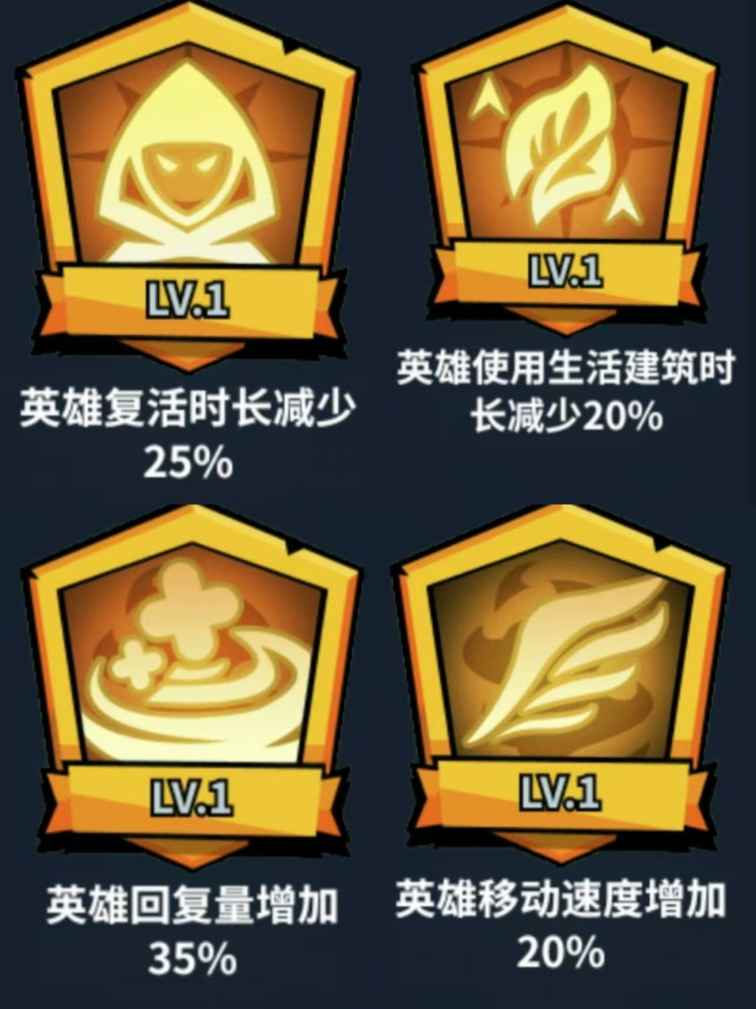 英雄受到的伤害减免(坦克和奶妈挂件扛不住时)>英雄吸血增加>英雄回复量增加>英雄复活时长减少=英雄使用生活建筑时长减少
