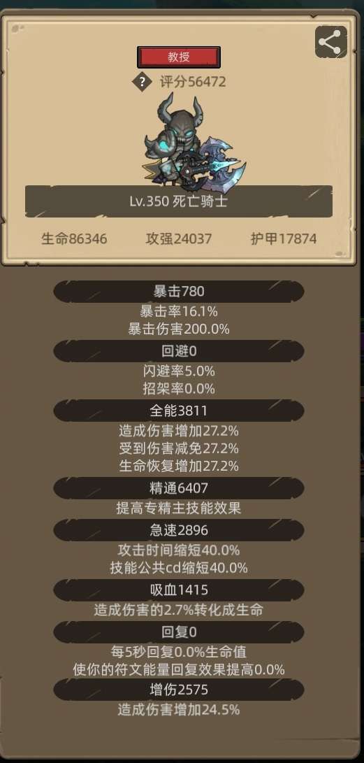 装备属性只有精通和急速是刚需,每件装备都要带一条精通,急速2800。其他属性低战力可以2800闪避(非挂机没必要满圆桌)其他属性全能最优。因为邪DK本体伤害占总伤害不到三分之一,且召唤物不吃本体暴击和增伤加成,所以暴击增伤收益很低。再由于本体伤害不高所以吸血收益也非常低(非挂机不建议带吸血,靠技能回血)总体来说7.2召唤系天赋(包括戒律牧)属性都是溢出的,战力是王道,主要属性堆起来,其余影响很小