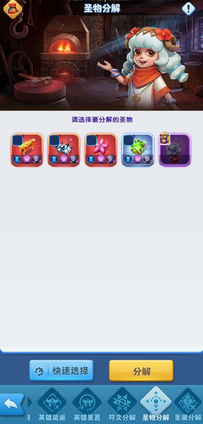 某个英雄的9件专属圣物全部精炼为T1之后,该英雄的传说和神话圣物才会出现在炼金坊的圣物分解列表中,才可被分解。