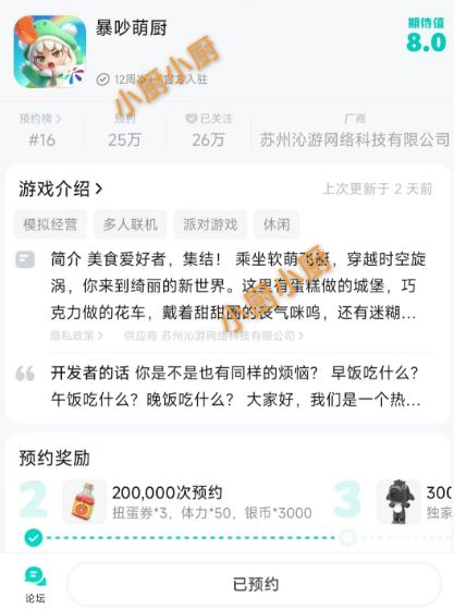 方式1-前往《暴吵萌厨》TapTap游戏主页,点击屏幕下方【预约】预约游戏。👇