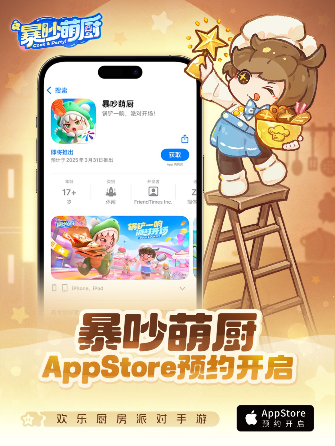 AppStore搜索游戏名:暴吵萌厨,认准小恐龙图标,点击【获取】预约游戏。