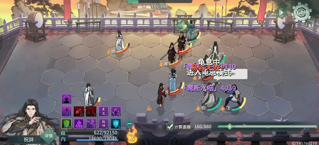 ④龟甲强袭:当祝辞发动攻击时,有30%概率额外丢出龟甲,将目标【晕眩】1回合攻击30%造成晕眩(1级,1回合)(除非触发大招+双倍【艮兑】卦才有概率打晕对面,建议不普攻