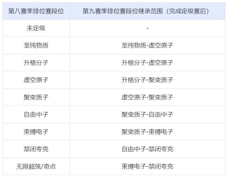 第九赛季开启后,引航者将需要重新通过定级赛来确定第九赛季的初始排位赛段位,第九赛季的初始段位将会根据引航者过往所有比赛的综合表现(主要因素)、第八赛季的排位赛段位以及定级赛综合确定,具体结算引航者可以根据下表进行对照: