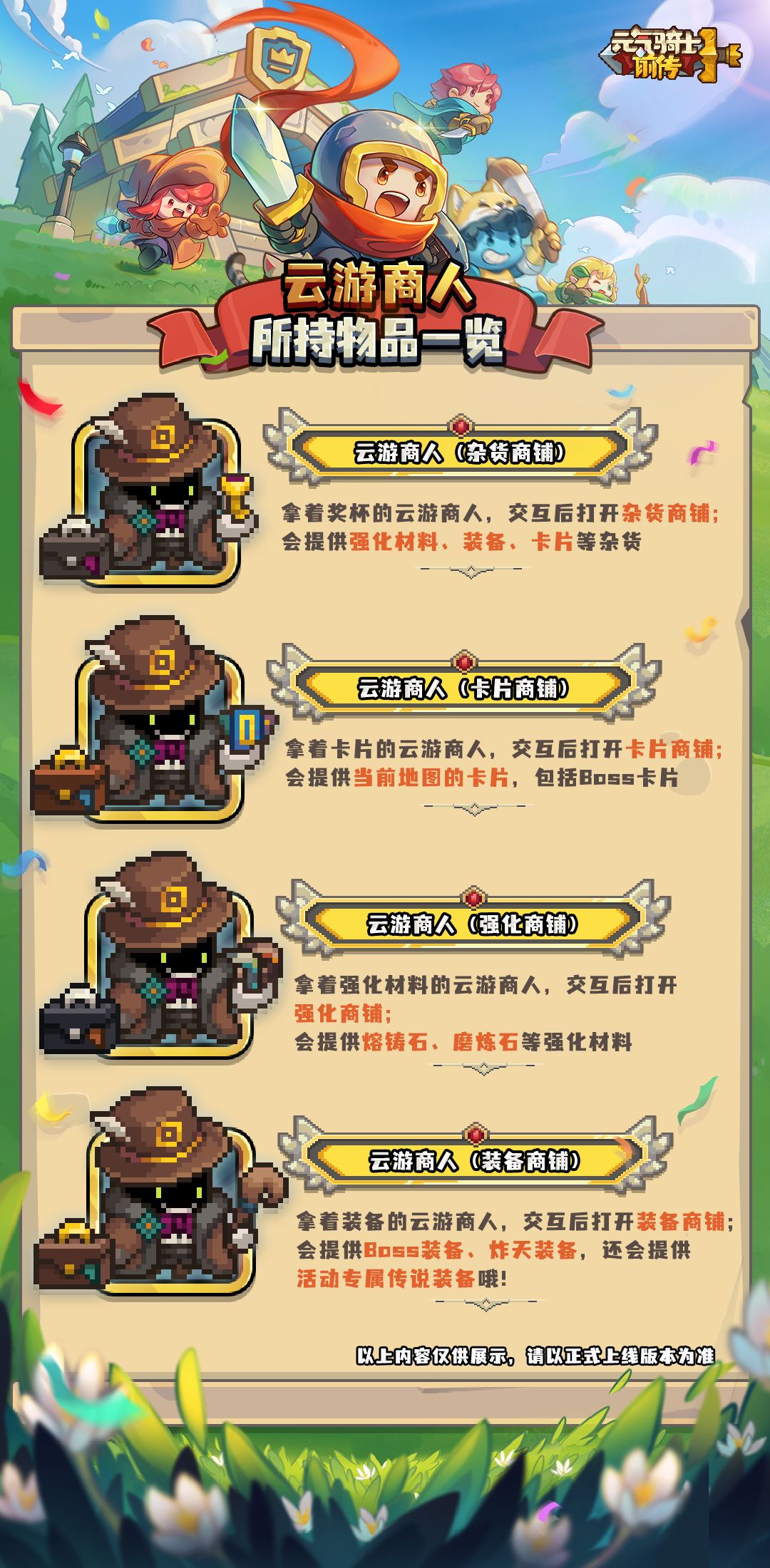 活动期间,小骑士们在进入地图关卡(包括精英关卡、投影关卡、试炼之地)时,必定会遇到云游商人。