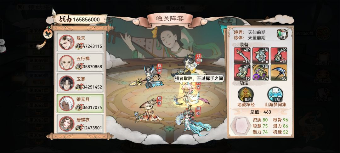 4、银无月:后排地藏位,道兵玉轮,功法使用地藏+山海,套装选择明光套,法宝使用三阶木。