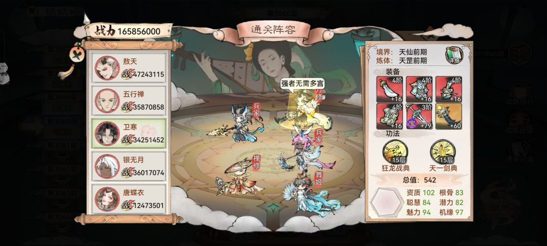 3、卫寒:后排补伤位,道兵巨灵,功法使用天一+狂龙,套装选择战狂套,法宝用三阶水竹。