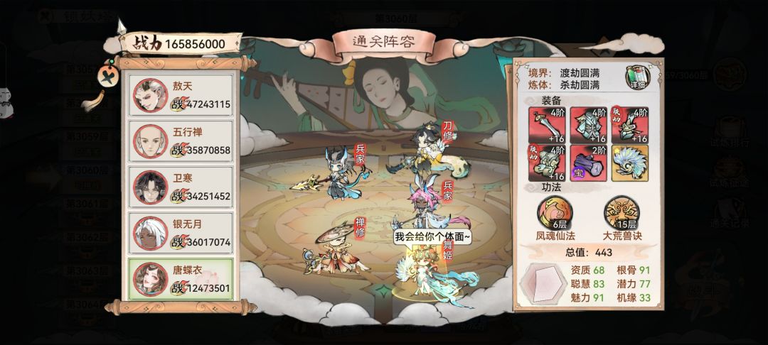 5、唐蝶衣:后排辅助位,道兵凤鸣扇,功法使用大荒+凤魂,套装选择明光套,法宝用二阶土木。