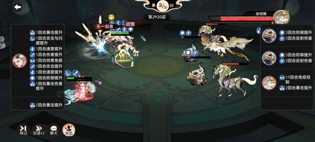 3、金翅雕:开局自带20回合效果免疫,横排攻击附带2回合伤害加深debuff,群体攻击可以自身两回合暴击。