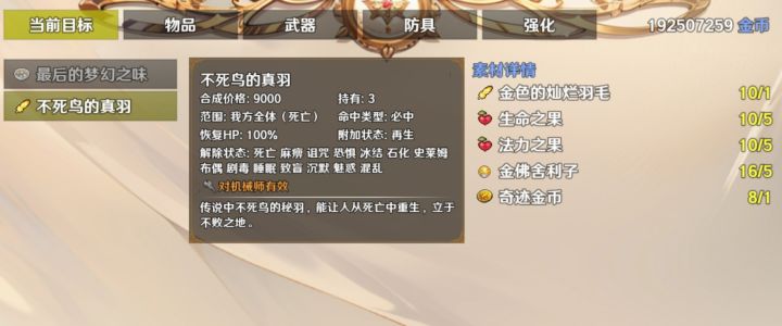 说一下不死鸟的材料,金色的灿烂羽毛拍卖场出,奇迹金币是去星山列车喂狗,一轮给一个,这个比较贵重。