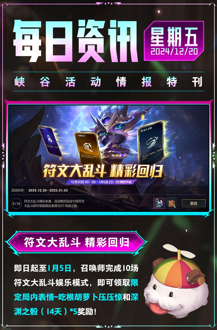 即日起至1月5日,召唤师完成10场符文大乱斗娱乐模式,即可领取限定局内表情-吃根胡萝卜压压惊和深渊之骰(14天)*5奖励!