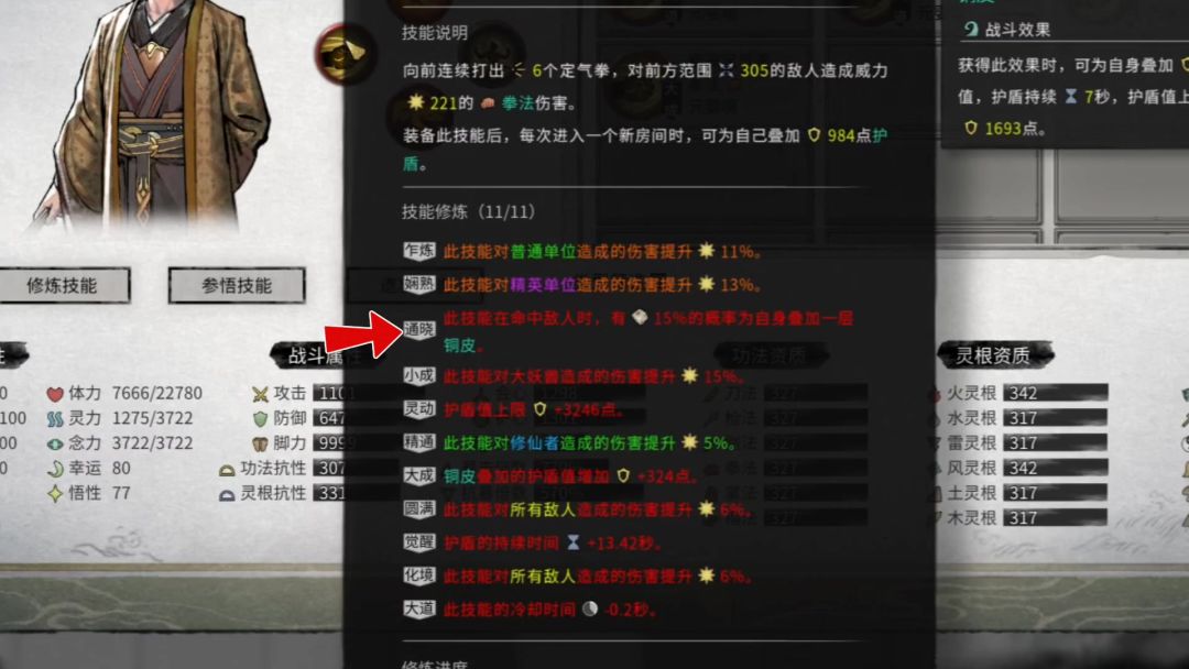武技:定气拳 核心词条(攻击敌人概率增加一层铜皮,冷却技能减少,护盾上限增加)