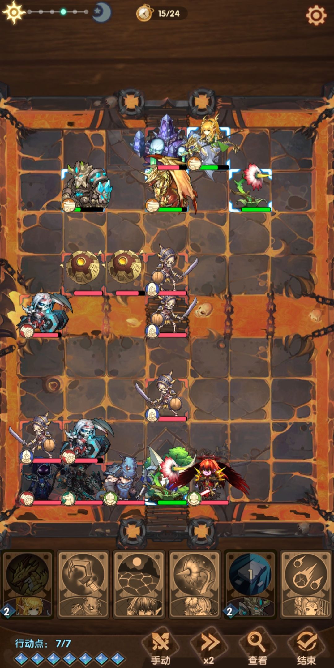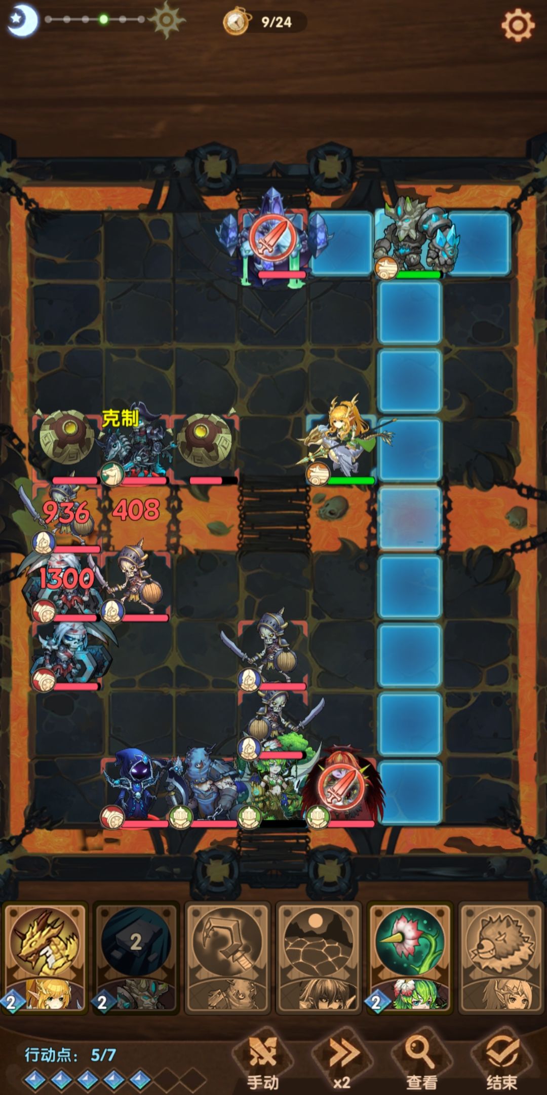 龙骑前进到搞事球所在行,然后撞三下,然它们仨整体左移一格。以免后期龙骑在王座右方偷家时被寒霜吐息。这里回合结束后龙骑一般接下来两个回合会连续被寒霜吐息,所以上月神帮忙抗住这两波。