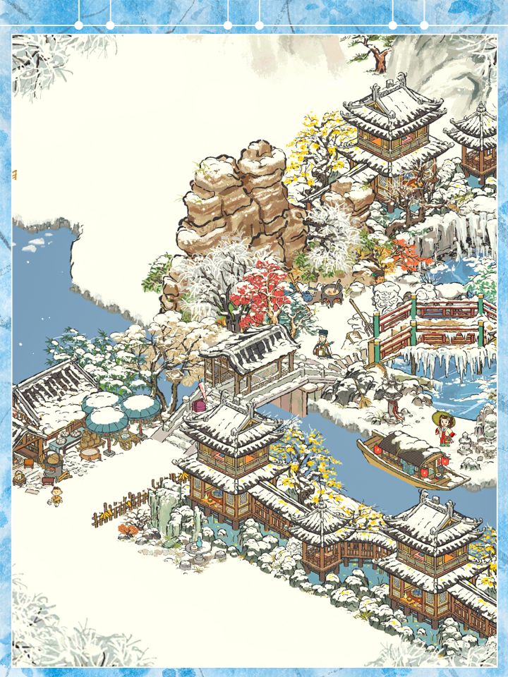 建筑:凝雪桥|雪落廊桥|听雪轩|湖上回廊|望雪亭|雪池凝冰|石林藏秀|晴雪塔|摇舟撒网|雪中小舟|残雪楼园|小雪石|雪满寒山径