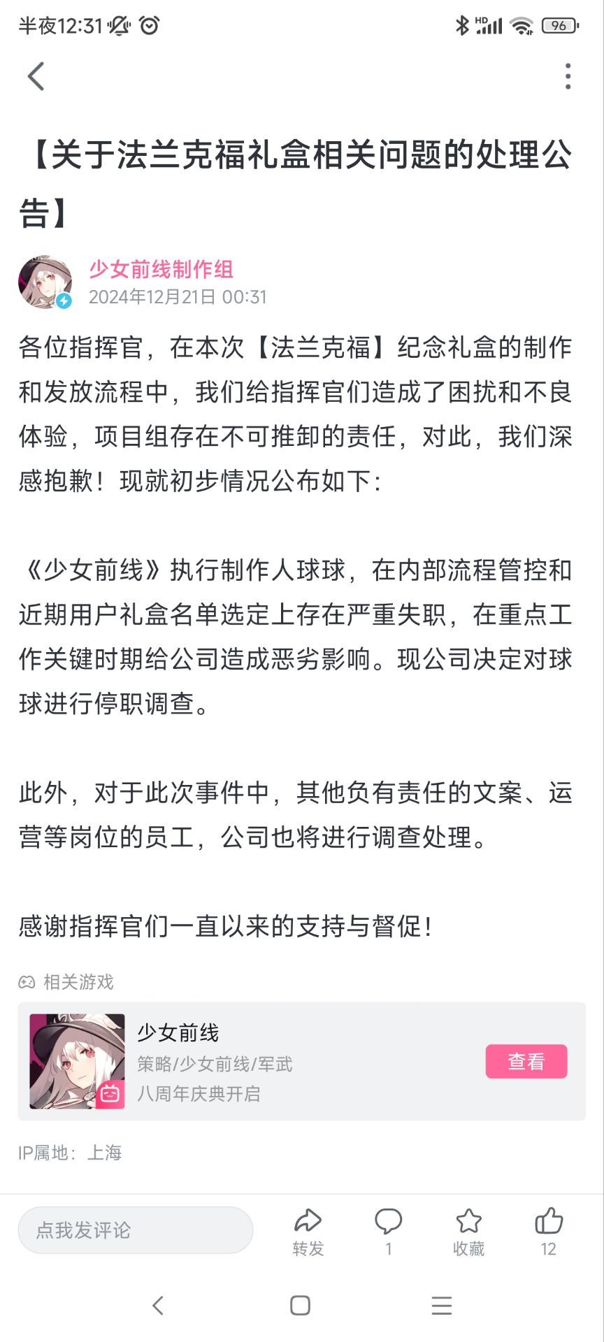 第二天,12月18日,少女前线制作组发布了一篇公告。