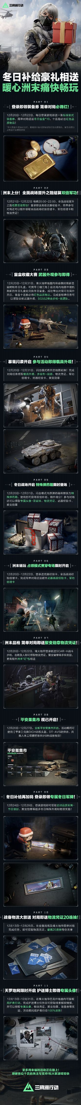 12月20日-12月22日,参与对局即送冬日盲盒,十连抽必得红色品质物品!全面战场双倍军功续杯!12月21日-12月22日,每晚20点~22点,全面晋升之路结算双倍军功!更有闪击模式轮换开启、冬日特殊补给及特殊弹药箱活动,参与即得海量豪礼!提前祝干员们周末愉快!玩的开心!