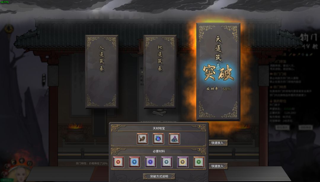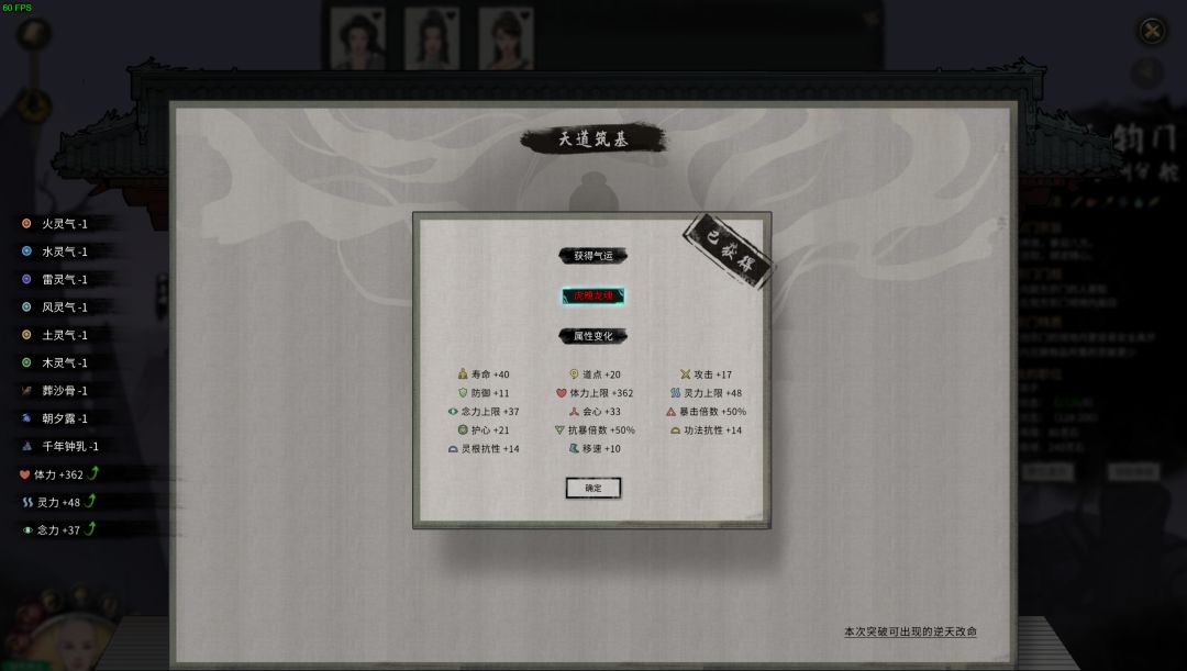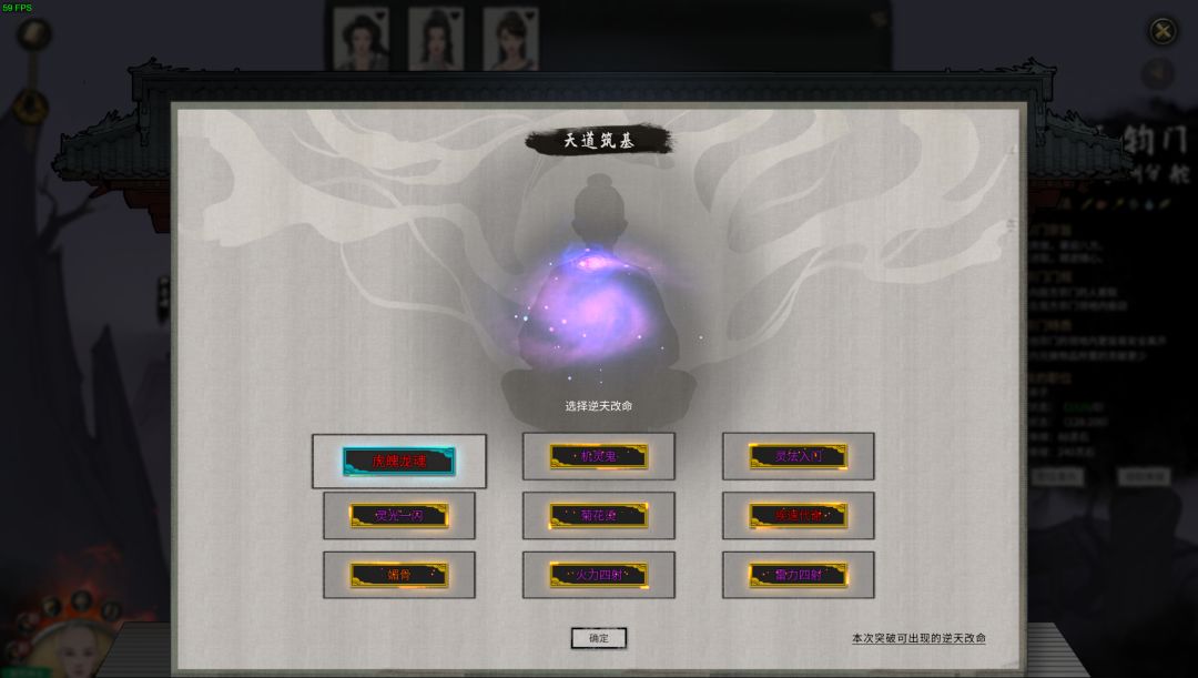 天道筑基材料全部准备好后,我们回到宗门,状态拉满,记得存档(非常重要),先不要再灵阁突破,成功后(失败也就是挨30秒雷劈而已,身法丹药用起来就行)逆天改命一共九个,推荐水力四射、武法入门等,这里我的建议是前期先选择对攻击有帮助的逆天改命,然后生存。如果你脸黑九个都是垃圾,那就去看宗门灵阁的逆天改命是什么,最好的攻击是杀心骤起、虎魄龙魂,有的话就在灵阁里选择突破就行。再如果没有,你就去看看其他宗门的有没有你想要的。最后如果全是垃圾,那就选一个对生存有帮助的就可以,别太担心,后期有的是道具能洗逆天改命。