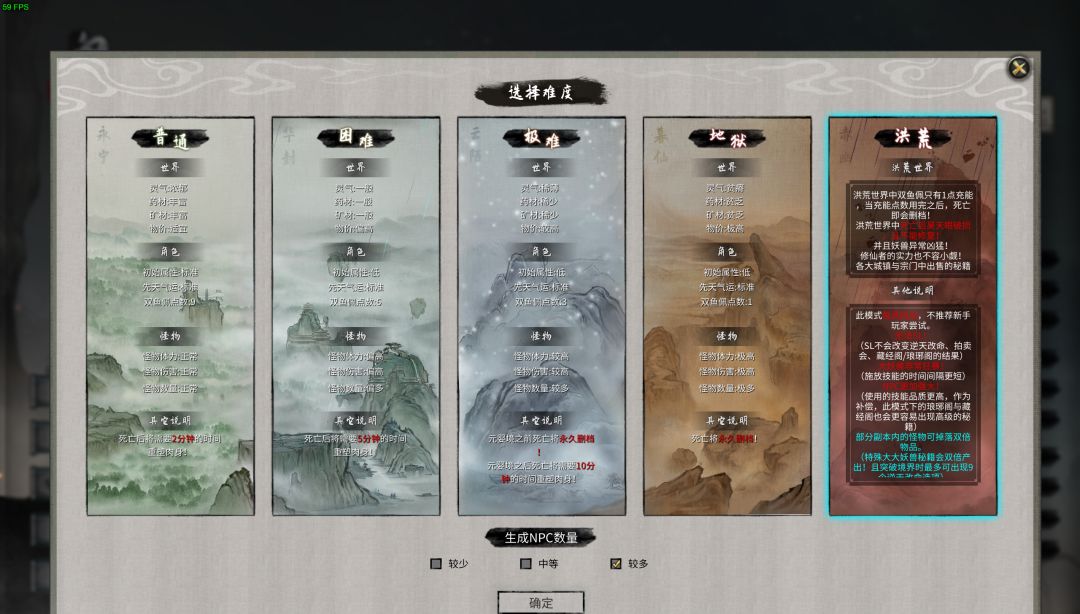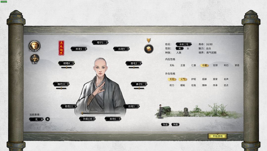 话不多说,我们直接进入。开局选择洪荒难度,NPC选择生成较多。进入捏脸环节,选择一个自己喜欢的造型,魅力值最好不要太高或者太低(可以避免很多不必要的麻烦),性格默认的中庸,天伦、义气。