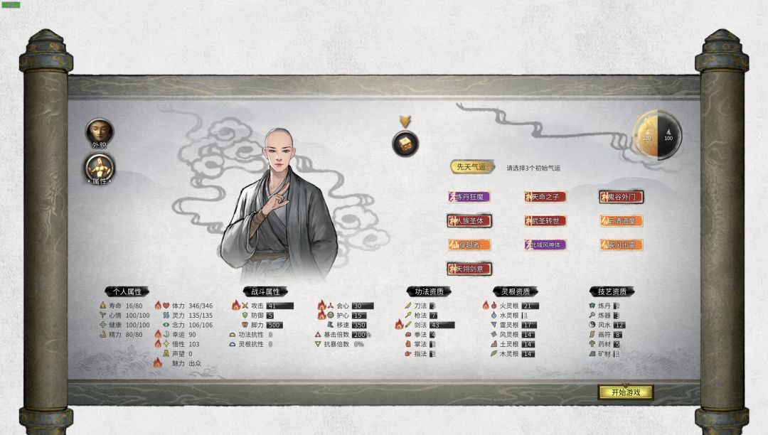 然后进入到气运的选择,页面中间的功法资质和灵根资质共12种资质,按照数值最高的那一项便决定你初始的攻击方式(可以不断R更换),再来看上边的先天气运(可选3个),洪荒难度不比其他,攻击力的优先级最高(没有攻击力加成前期很折磨,具体表现为小怪一下打不死,boss刮痧等,这会带来很多的衍生问题,所以不要小看前期的加成),其次是悟性、移速等,在选择气运时,最好选择能够加攻击力的词条,10点最好,5点其次。对于新手来说,不论你是想玩什么流派,我都推荐你剑修出门(后期可以吃果子改的别担心),所以以下攻略主要是围绕剑修开展。气运具体是不是3红或者橙色不要纠结,选择通用的加攻击力词条的皆可,有(比如鬼谷外门、人族圣体等攻击力和悟性都有的更好),一些词条的负面效果大可不必担心。最后根据气运和(剑)资质最好综合确定,便可以进入游戏。