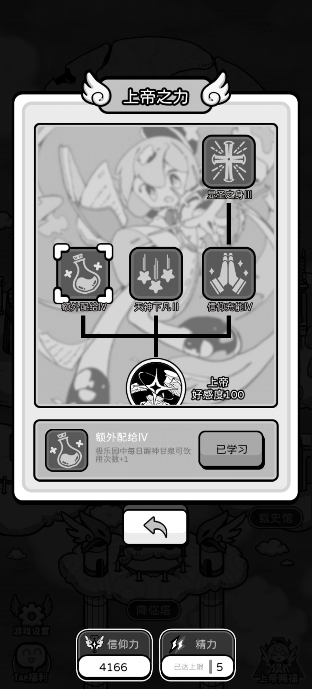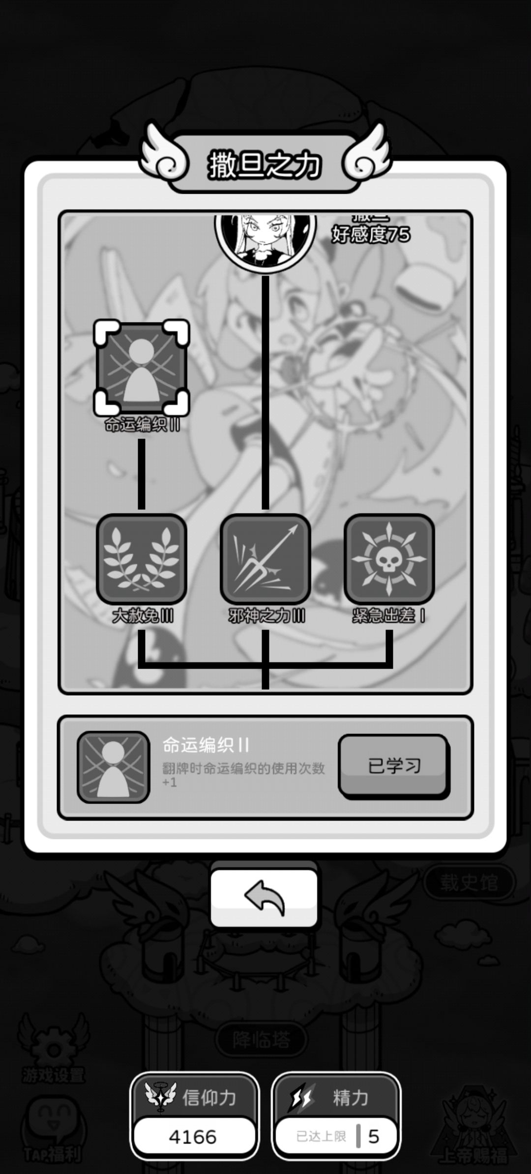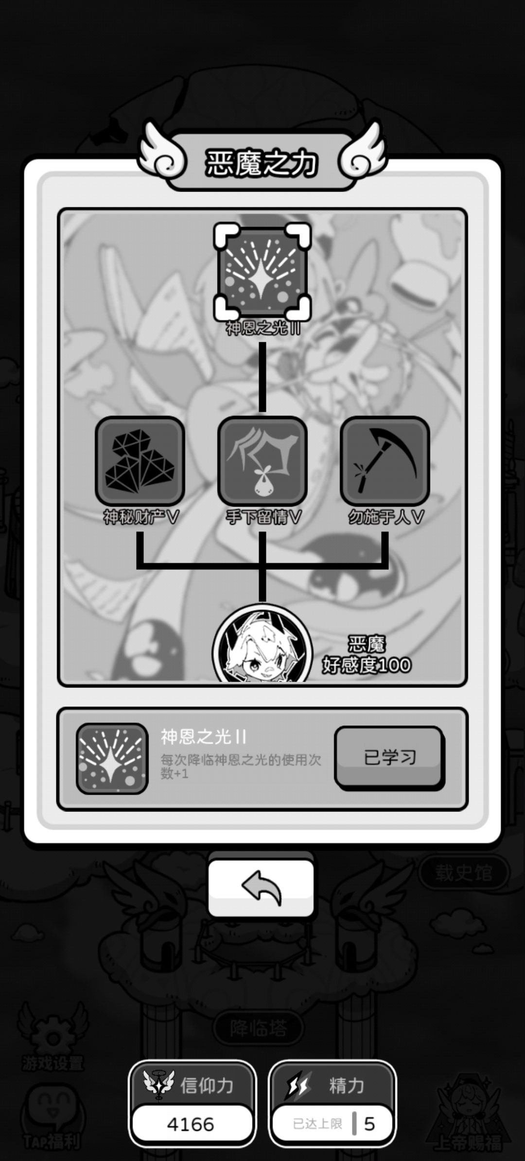 恶魔的话就比较简单一点了,在审判中我们对抗失败时他给降临人扣的数值减少,每次降临给笔钱,以及增加神恩之光的使用次数