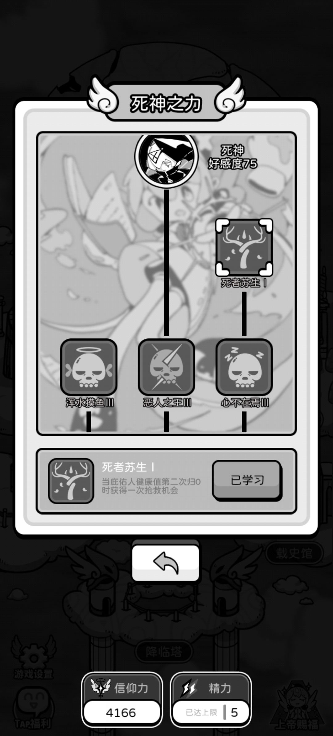 死神点基本上是保命用的,点满能在生命值归零的时候拉去医院进行运气检测了,点满就可以有三次检测机会