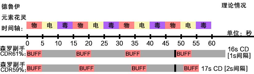 通过调整CDR的数值可以让森罗BUFF和闪电元素对上,但是CDR数值越小,两次变身中间间隔时间就越长(变身间隔期间输出很小可以忽略)。CDR61%的时候4次变身中间会有3s间隔,当CDR59%的时候4次变身中间会达到6s间隔。