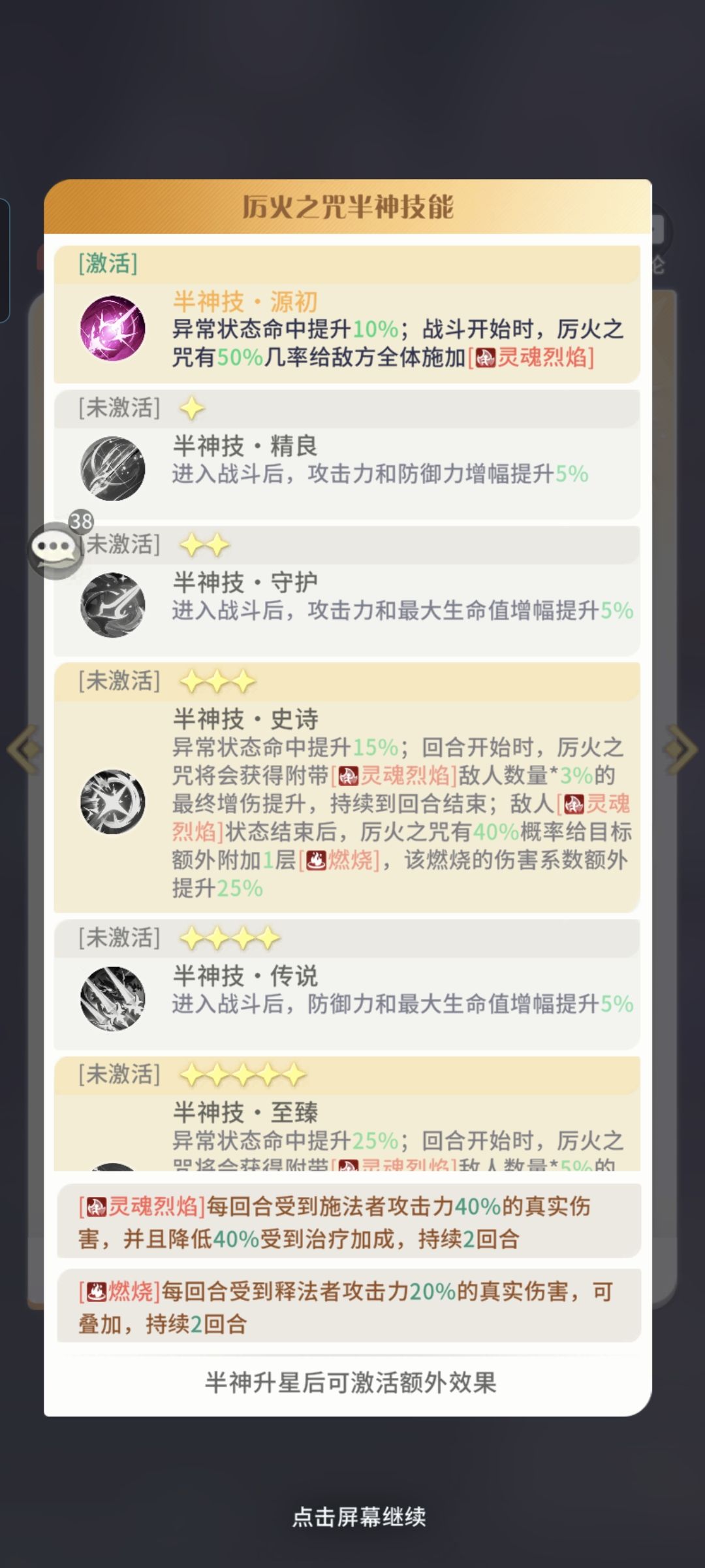 ●半神技·源初:战斗开始时,厉火之咒有50%几率给敌方全体施加灵魂烈焰,每回合受到施法者攻击力40%的真实伤害,并降低40%受到治疗加成,持续2回合。