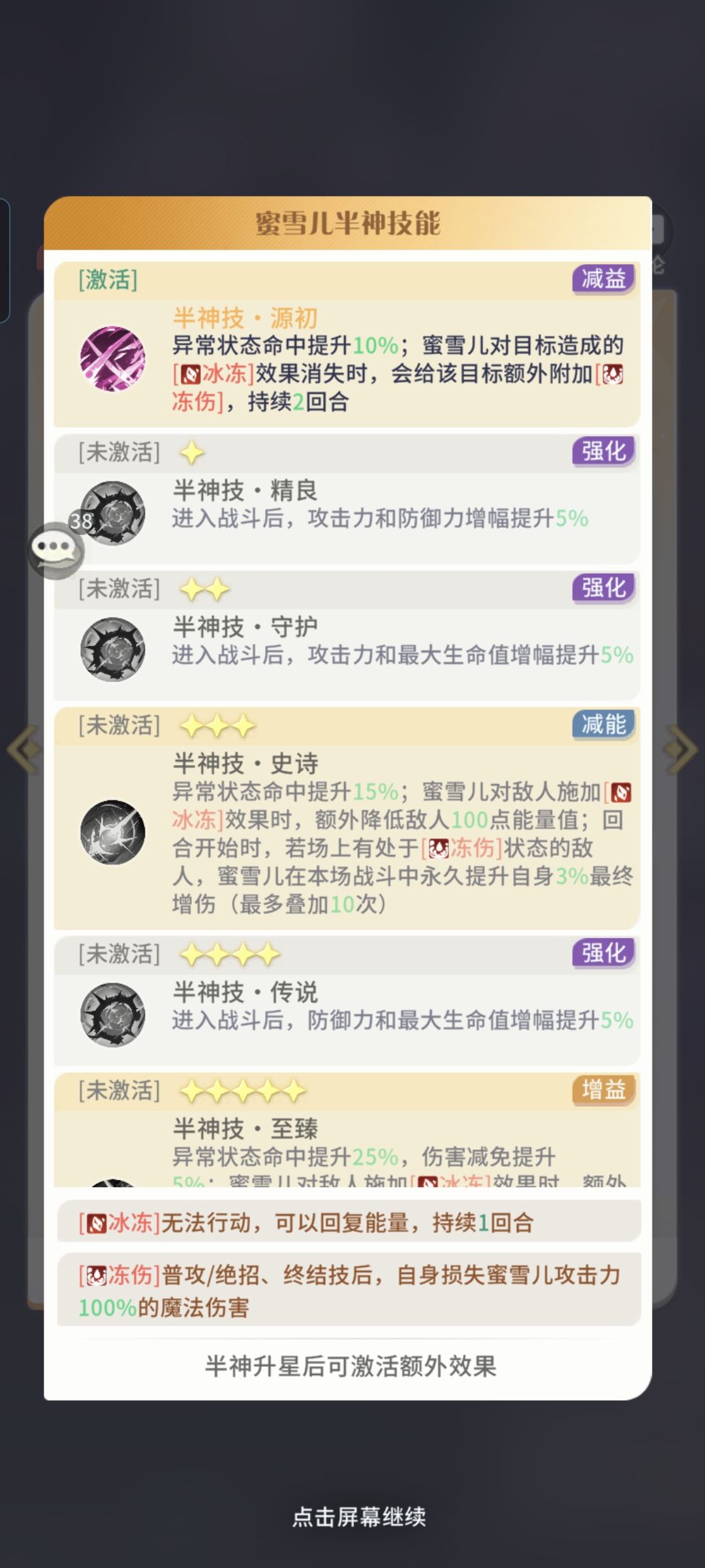 ●半神技·史诗:战斗开始时获得1层元素护佑,元素护佑可获得10%的伤害减免,最多叠加3层,持续到战斗结束。