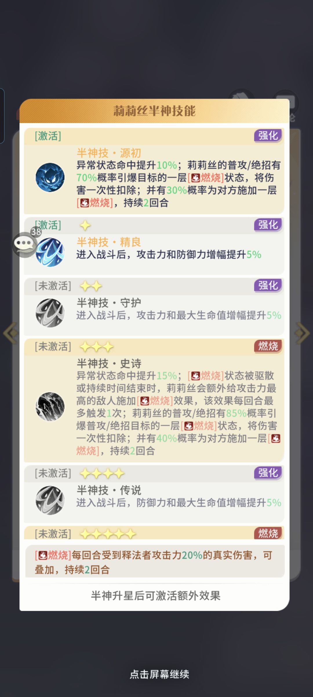 ●半神技·源初:莉莉丝的普攻/绝招有70%概率引爆目标的一层燃烧状态,将伤害一次性扣除,并有30%概率为对方施加一层燃烧,持续2回合。
