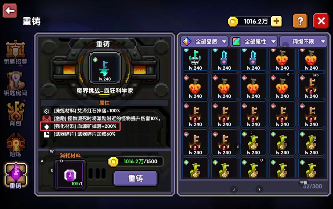 紫色钥匙无词条掉落1血源矿,+200%词条掉落4血源矿