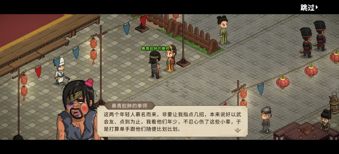 一路叽叽喳喳聊,我心情稍好,赶到擂台,但见一鼻青脸肿的拳师靠于旌竿下。我问:“你这是怎么了?好像伤得不轻?”