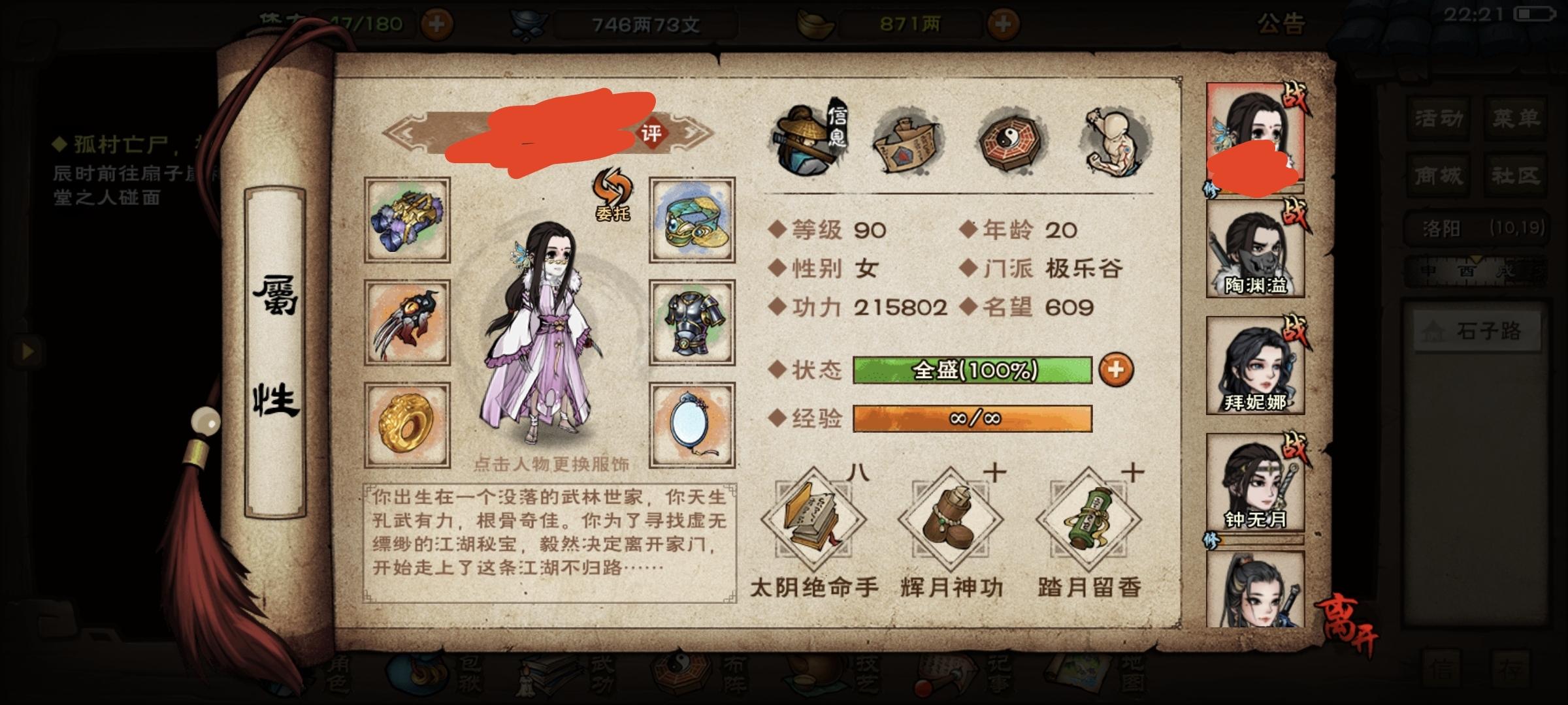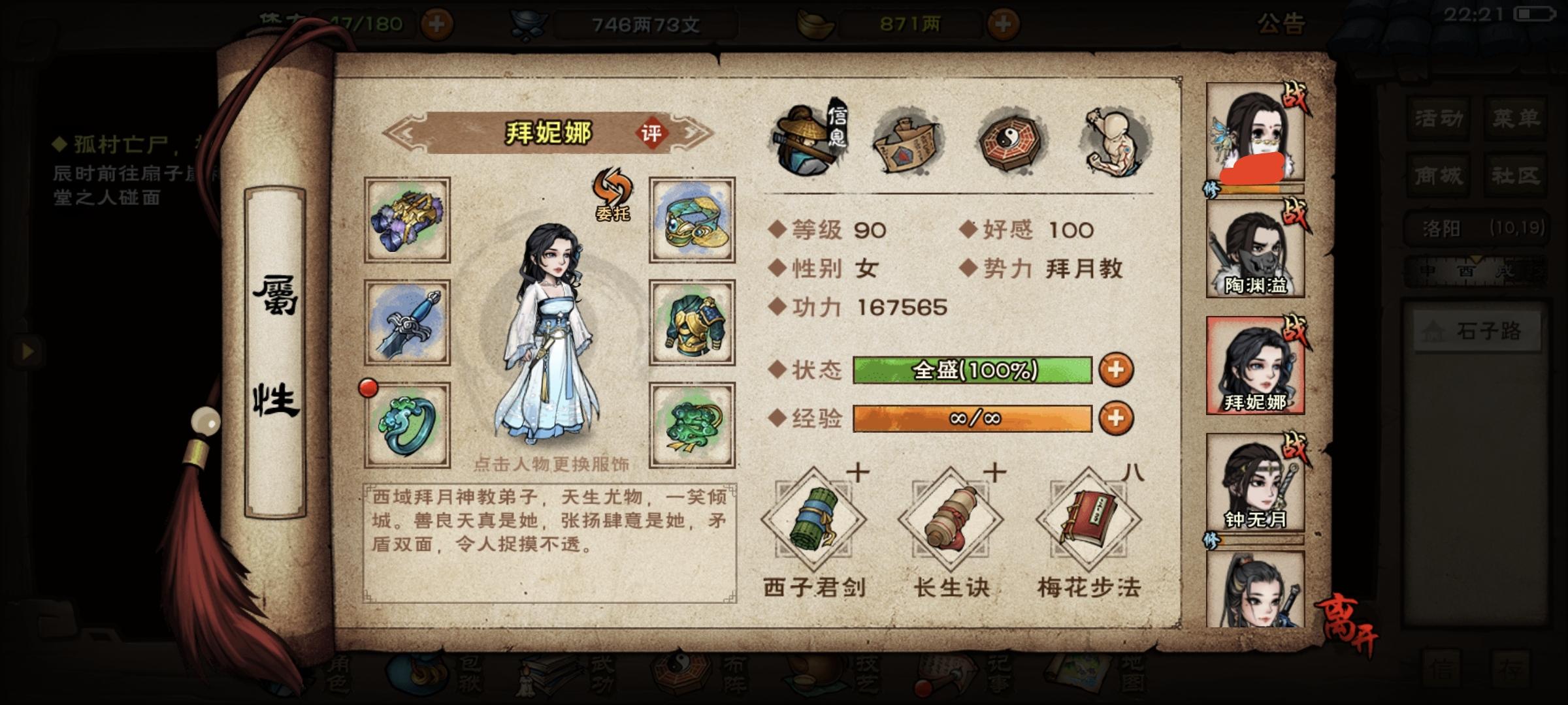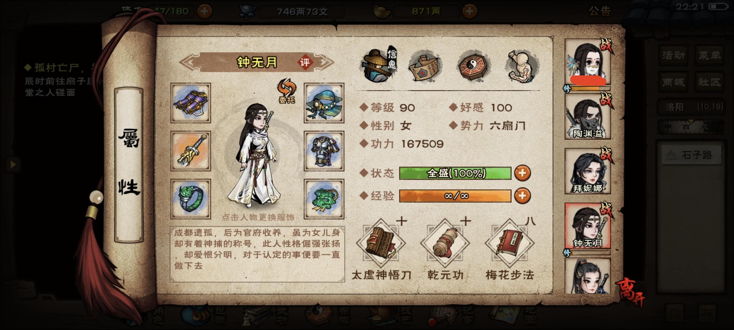 前两天狠心掏400两巨款搞了天魔舞,目前7重,过两天升8重开了固定3免给钟带上。其次慢慢攒幽行步给西子拜用用。