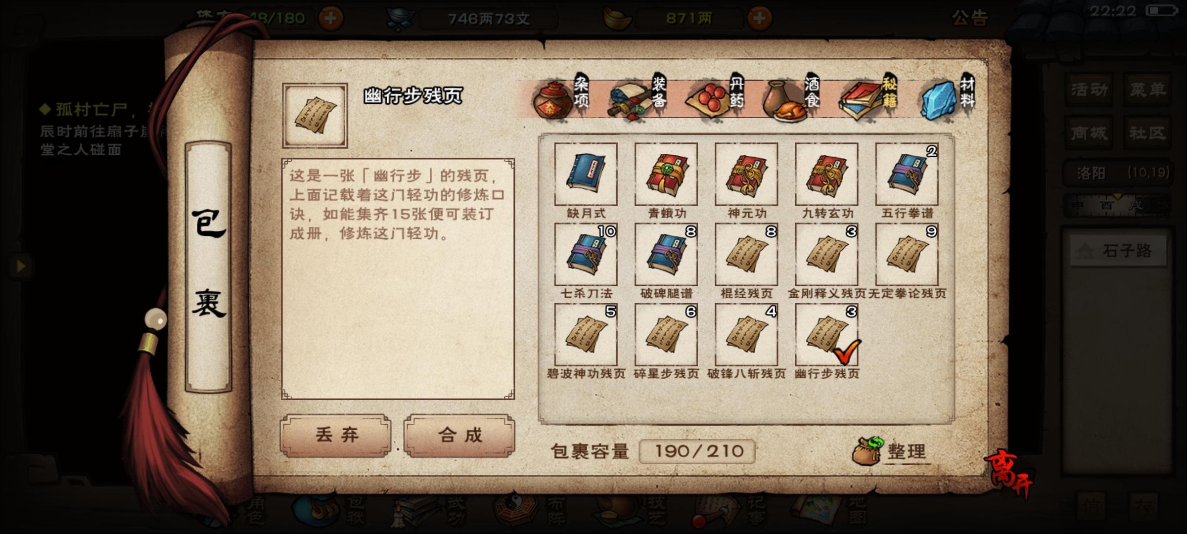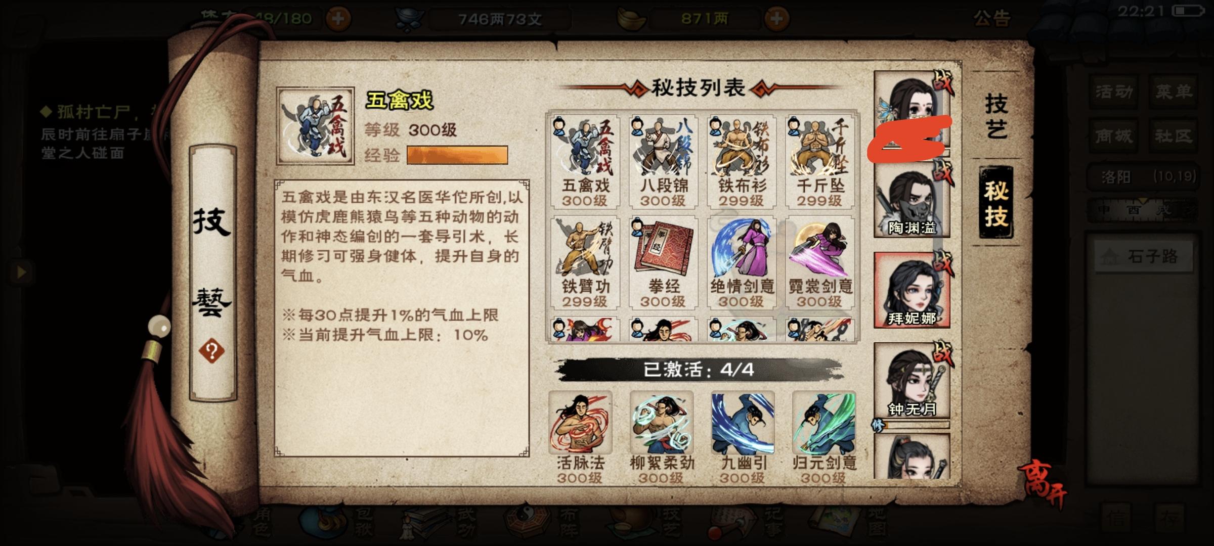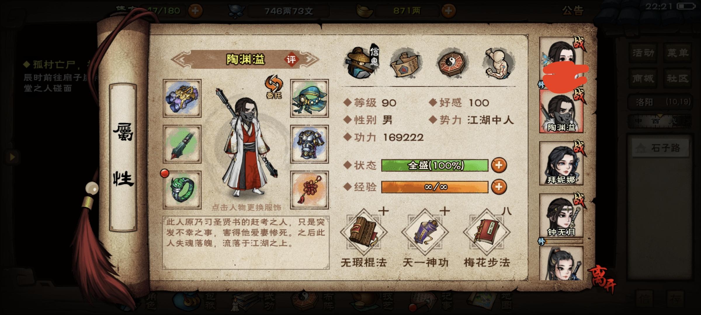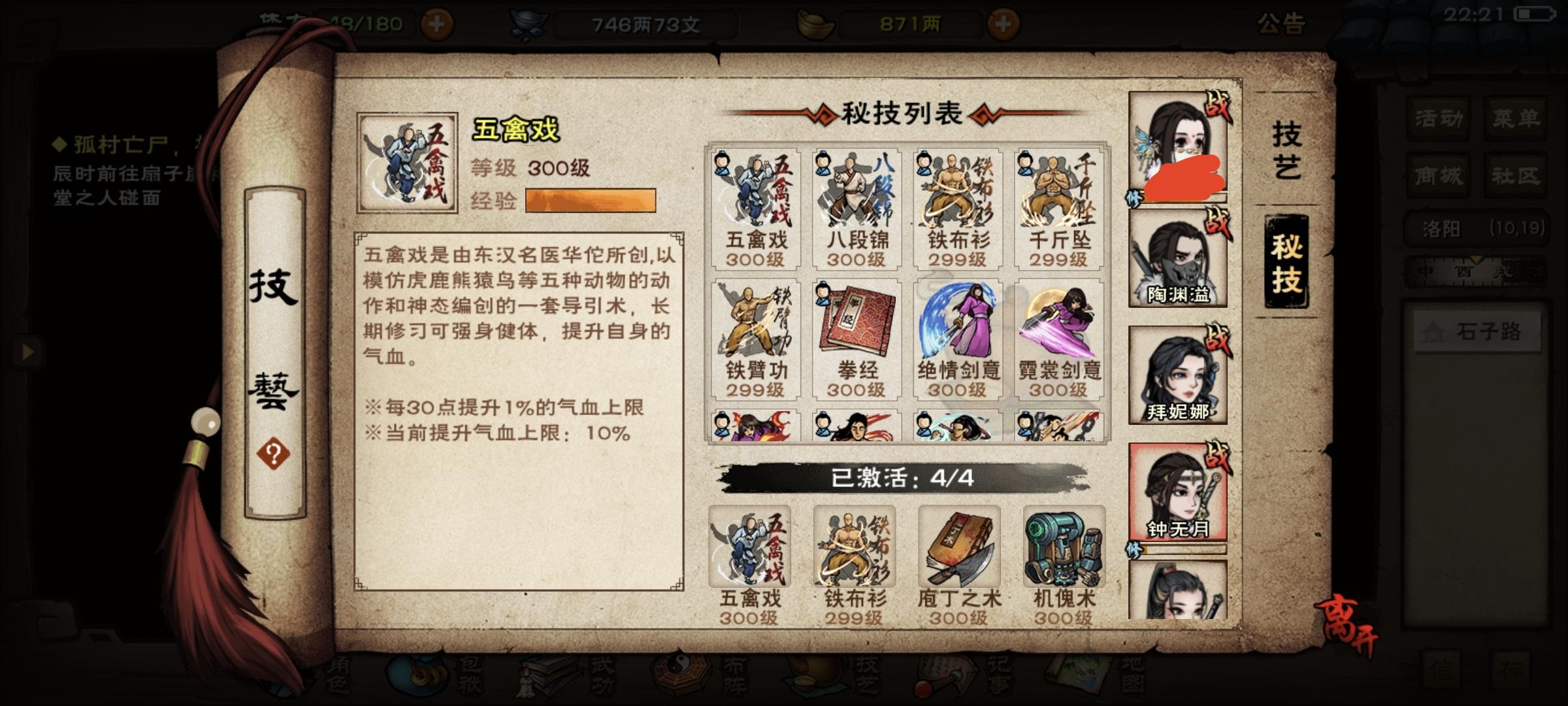 前两天狠心掏400两巨款搞了天魔舞,目前7重,过两天升8重开了固定3免给钟带上。其次慢慢攒幽行步给西子拜用用。