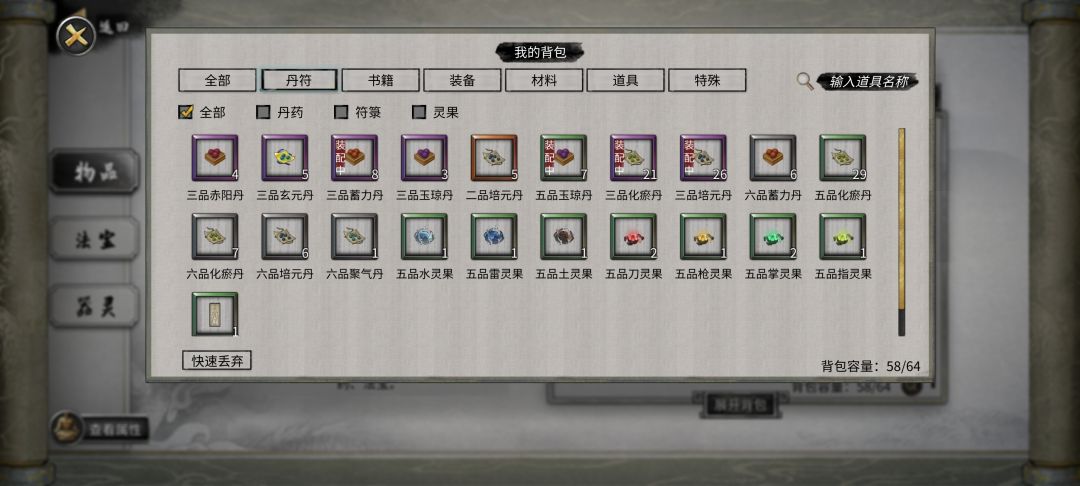 ①丹药:包括突破丹药,回血丹、回灵丹、元阳丹、还魂丹等(注:灵盾符也被划分到了丹药)