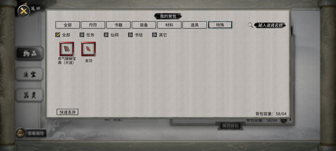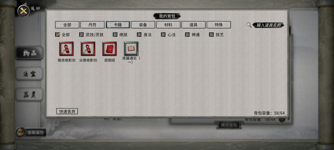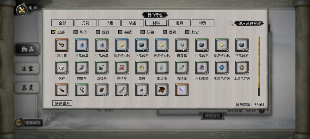 材料中共包括:炼丹、炼器、突破、妖兽、器灵、其他(指的是带有妖兽位置的书籍)