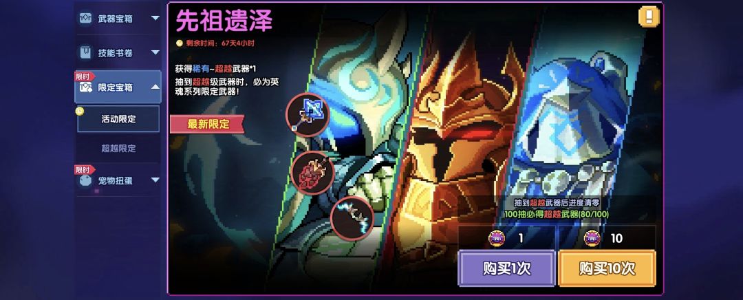 2、黄金宝箱币抽。千万别用钻石买黄金武器币!千万别用钻石买黄金武器币!千万别用钻石买黄金武器币!新手谨记。100抽会保底给1把,一般是配合一些活动一起的时候来抽,比如每周70抽送一个魔女宝箱的活动、新bd刚出会有掉率概率提升的活动、新限定武器刚出的时候也能用黄金宝箱比抽,后面就只能用珍藏币抽了。