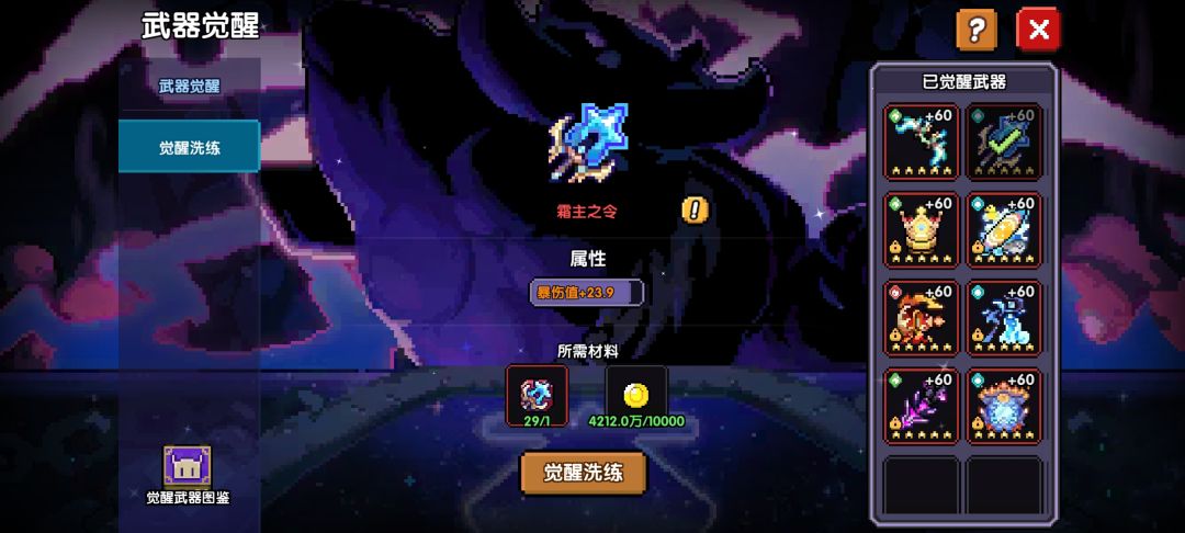 第3点的武器属性词条洗好之后,就能去把觉醒属性词条洗洗了,同样的洗到紫色或者以上就收手。