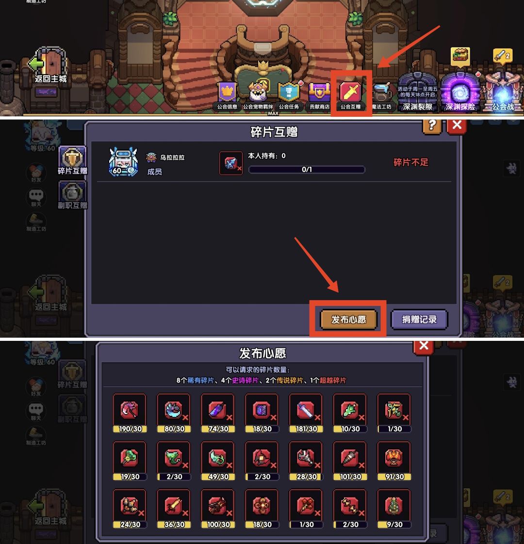 4、蹭公会。每天在公会的公会互赠里,发布心愿要1片武器碎片。
