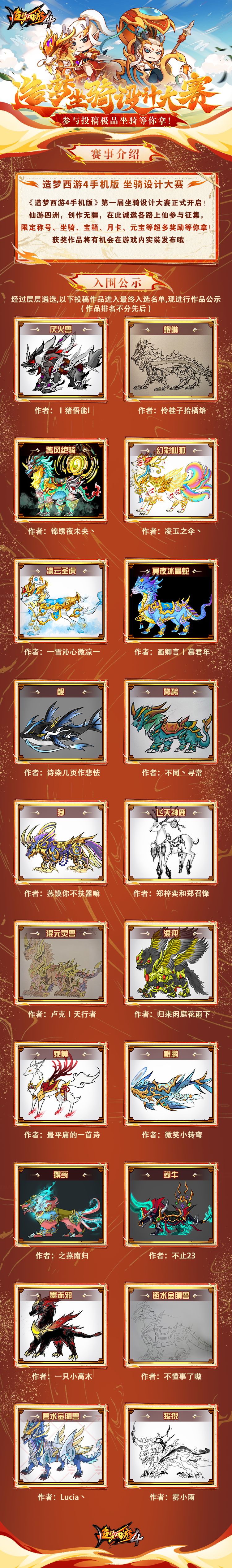 坐骑设计大赛征集期已结束,期间收到大量的优质投稿,非常感谢各位上仙的热情参与