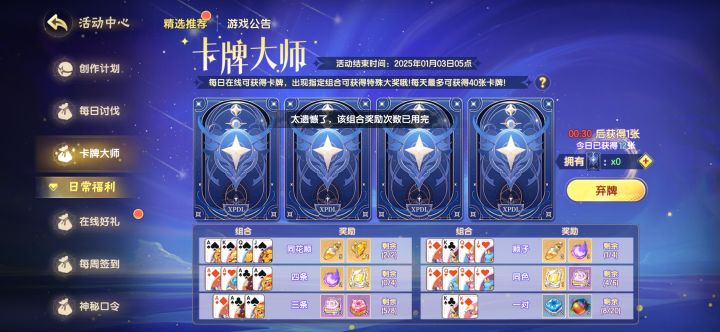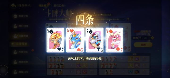 如题,这个活动我最开始以为奖励次数到了就不会再给对应东西了,现在发现想错了,所以还是不能无脑开,看一下前两张前三张是啥,不行还是得弃牌,优先搞同花顺,不然脸黑可能活动结束都出不了一个同花